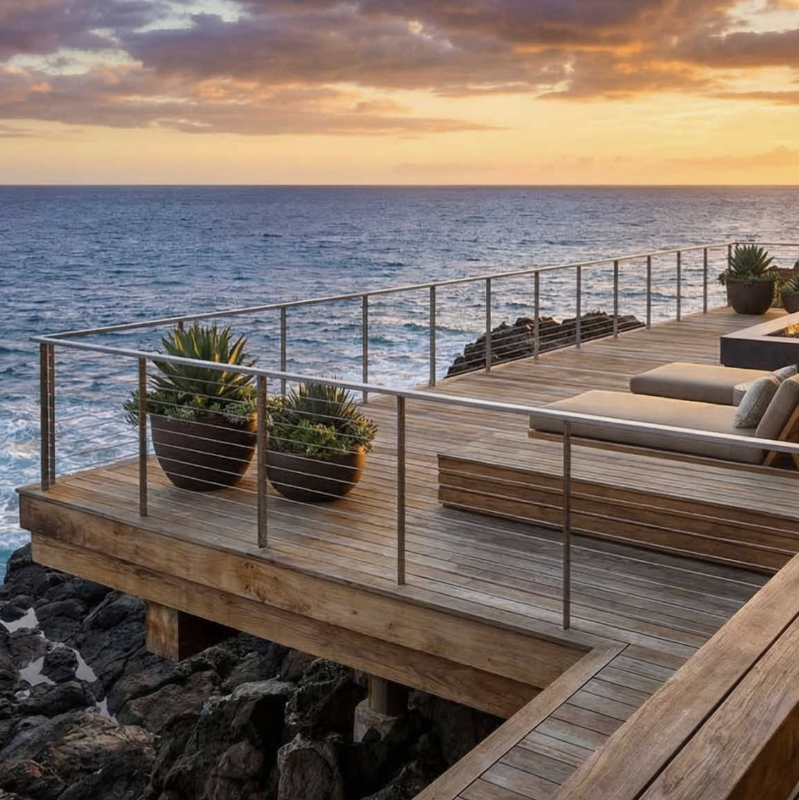 1. A wide‑angle photo of a modern deck with stainless steel cable railings overlooking the ocean.